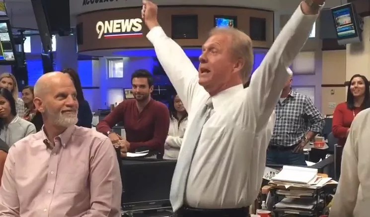 A screen capture from a 9News video in which anchor Mark Koebrich can be seen celebrating during his 2015 retirement announcement.