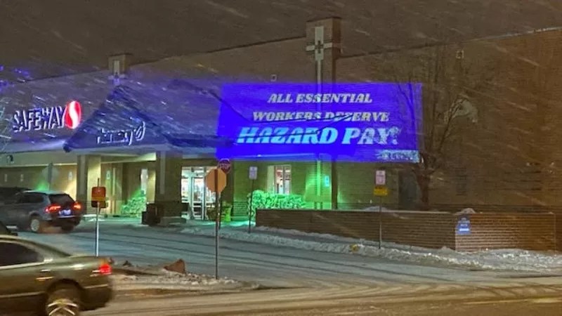 On December 14, several Denver area grocery stores displayed unusual light shows – but the businesses weren’t responsible for them. UFCW Local 7, whose members include many of those working at major supermarkets, projected images (some featuring Dr. Seuss’s Grinch character) calling for a return of so-called “hero” pay – a $2-per-hour bump given to employees during the early days of the COVID-19 pandemic because of the risks they took to serve the greater public – on King Soopers and Safeway outlets.