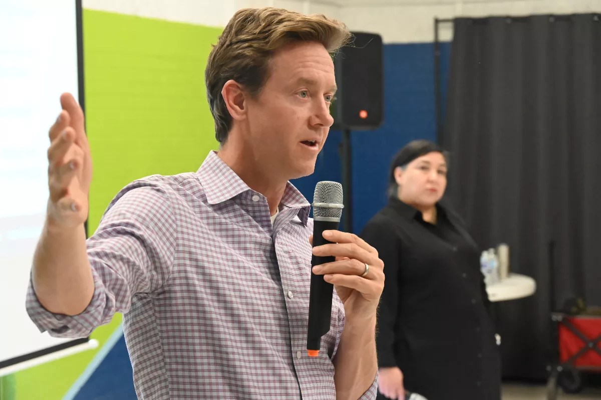 Mayor Mike Johnston talks to La Alma residents about a 150-person homeless encampment in their neighborhood during an April 9 town hall at the Denver Inner City Parish with Councilwoman Jamie Torres.
