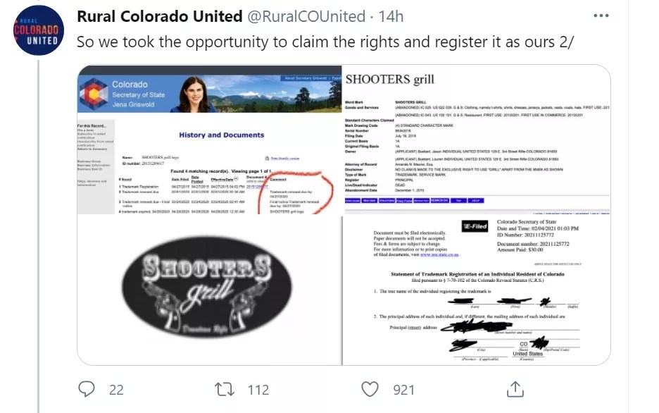 While researching Boebert’s latest legal snafu, George Autobee and his RCU colleagues decided to take advantage of some congressional oversight. “A few months ago, while doing some research into @LaurenBoebert’s seven LLCs (which we suspect are used for both tax avoidance and money laundering), we noticed that she had failed to renew the rights to her logo for Shooters Grill at both the state and federal level,” RCU says in the first of a series of tweets. “So we took the opportunity to claim the rights and register it as ours.”