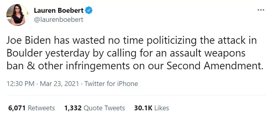 Boebert’s extreme hypocrisy isn’t just limited to her newsletter. She’s all over the place on Twitter, using the Boulder shooting to try to score political points against the current administration while at the same time claiming to be horrified by those using the tragedy for their own ends. And she wasted no time in doing so.