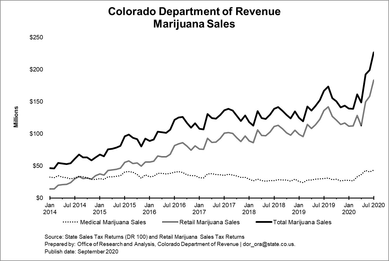Monthly medical marijuana sales – reserved for medical marijuana patients who live in Colorado – only eclipsed $30 million twice in 2019. But this year, MMJ sales have beaten that number every month since March, with July medical marijuana sales hitting $43.3 million, the highest tally in that category since recreational sales began in 2014. Recreational sales also set a new personal best in July, reaching $183.1 million.