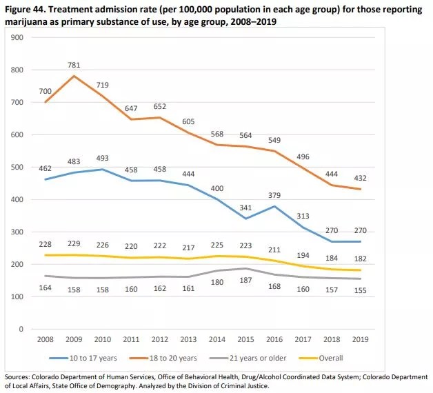The overall rate of treatment admissions for those reporting marijuana as their primary substance of use decreased from 2012 to 2019, the report notes, dropping from 222 admissions per 100,000 people in 2012 to 182 in 2019.