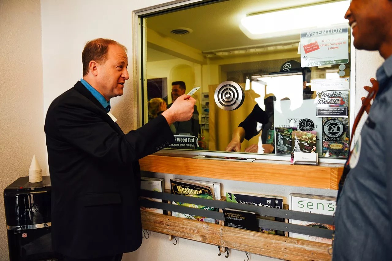 Colorado Governor Jared Polis, seen here visiting a dispensary, has issued numerous executive orders related to marijuana during the COVID-19 pandemic.