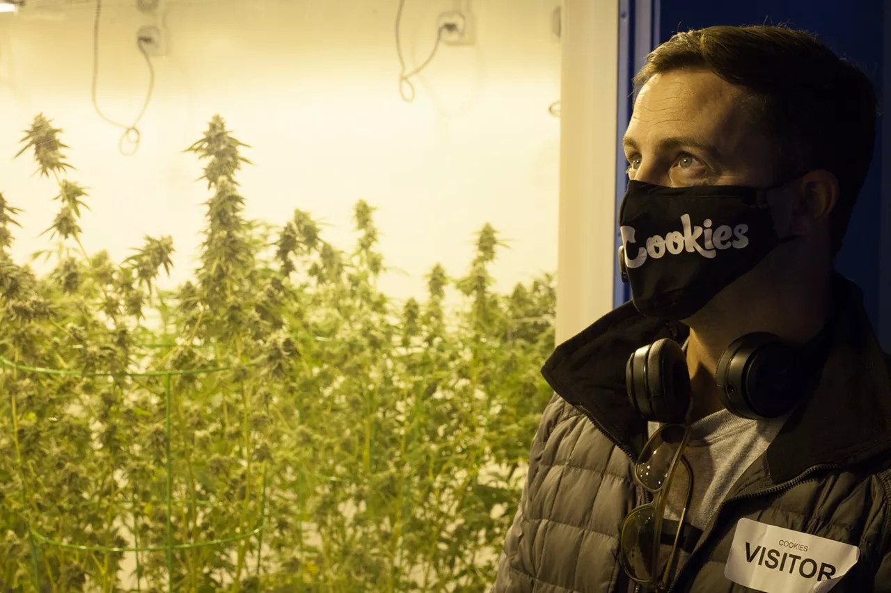 A visitor inside Denver's new Cookies dispensary gazes upon the store's supplying cultivation.