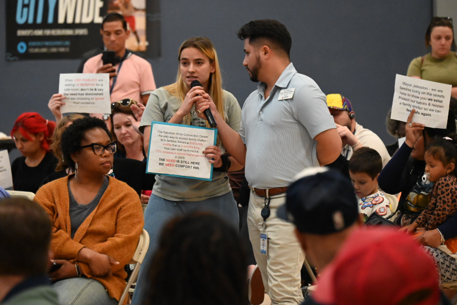 A handful of protesters from Housekeys Action Network Denver (HAND), an advocacy group for homeless residents, attended Johnston’s town hall to criticize his closure of the Comfort Inn to save money. While he spoke, they held up signs reading “the need is still here” and “don’t sell the comfort.” Activist V Reeves argued that the city seems to always have money for downtown improvements, sports venues and the Denver Police Department, which is receiving a small budget increase in 2026.