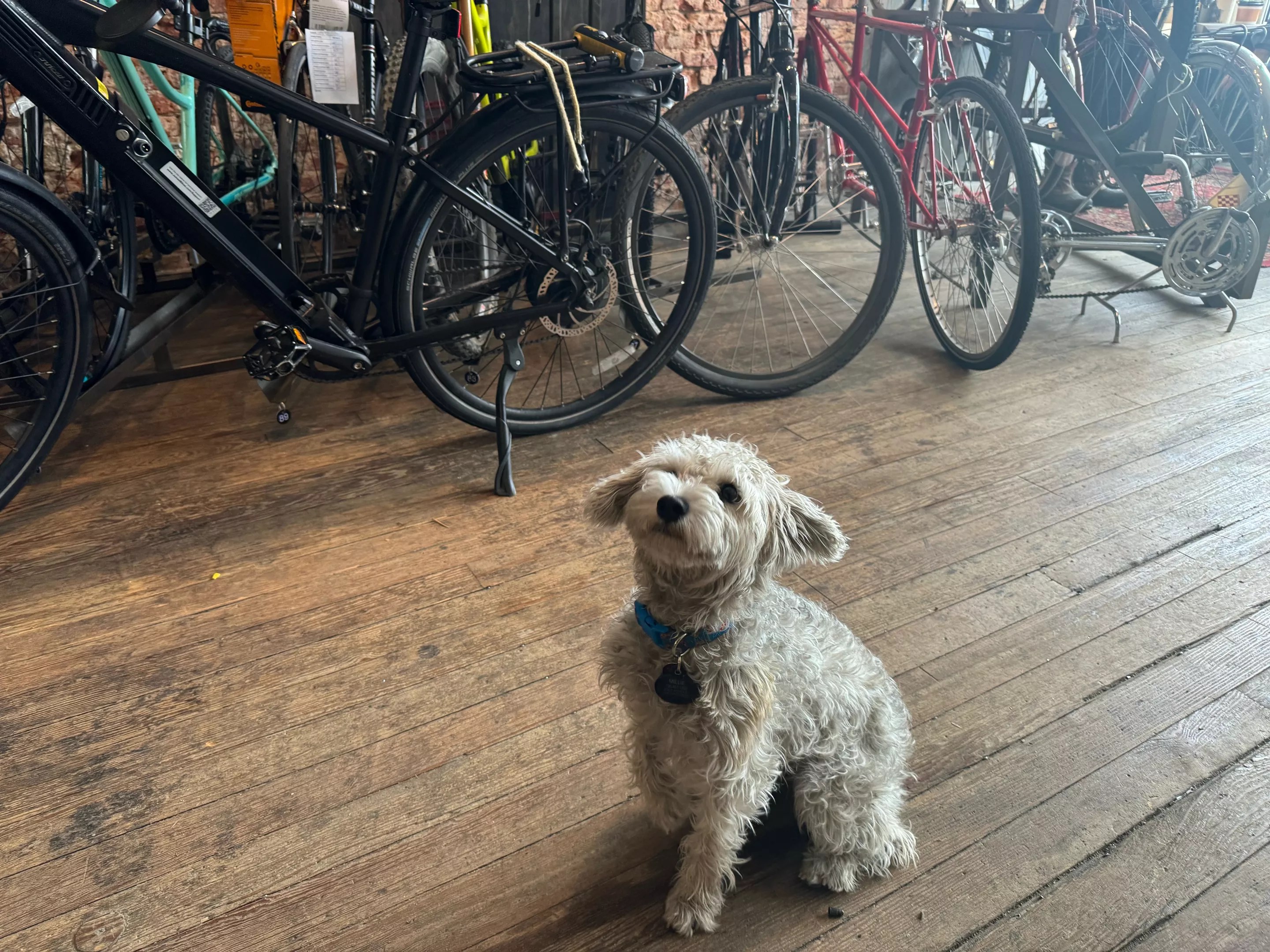 Among piles of tires and empty bike frames at Z Cycle Shop roams Millie, the store’s newest resident pup. Recently rescued from a shelter in Fort Collins by one of Z Cycle’s new owners, Daniel Spicher, Mille’s known for having strong poodle energy but is every inch a mutt – and just as friendly as one, too. Millie can be found hanging out at the store, excitedly greeting customers and dogs alike. According to Spicher, some customers will come in just to see Millie, who is now an integral part of Z Cycle…as long as she’s not chewing those tires.