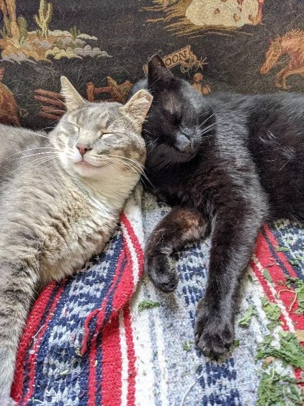 Shop cats Jack and Eliot cuddle up and prepare to meet customers on a handcrafted rug in Old Santa Fe Pottery.