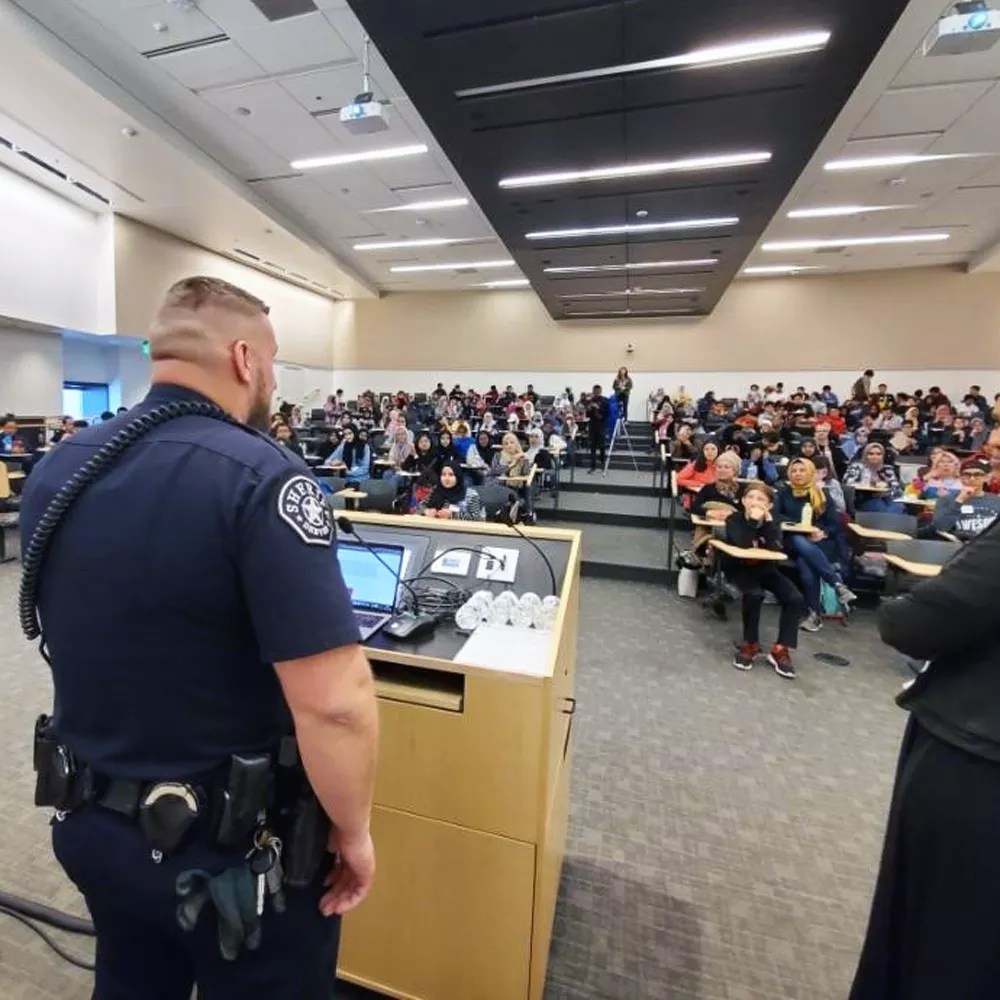 Melis Ibisevic speaking to Muslim youth about working in law enforcement.