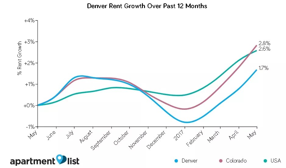 Moreover, Denver rent lags behind the national rate of increase – something that’s not the case for Colorado as a whole, as seen in the following graphic: