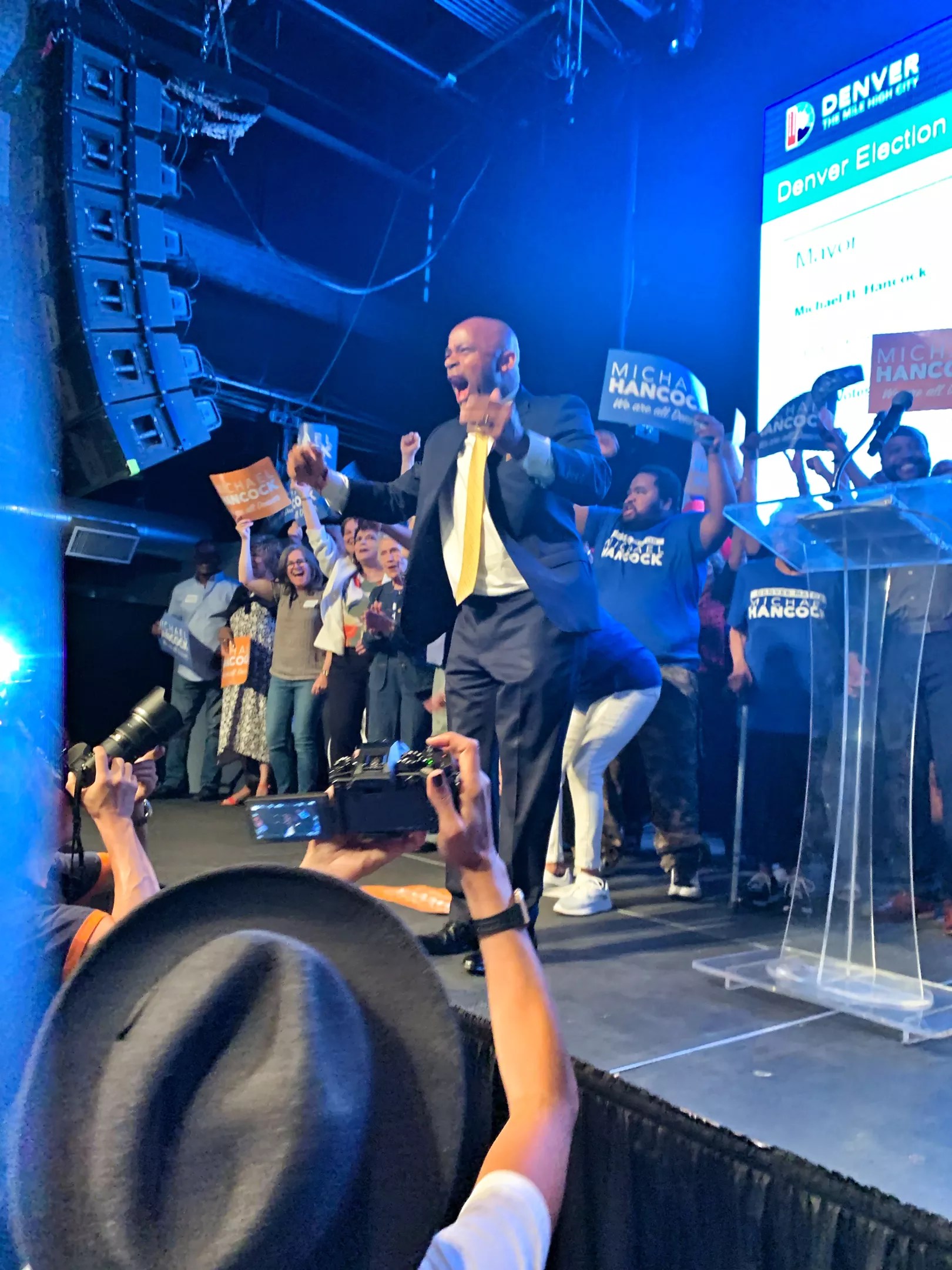 Mayor Michael Hancock ran on stage at his campaign’s watch party, pointed toward the heavens, then pumped his fist.