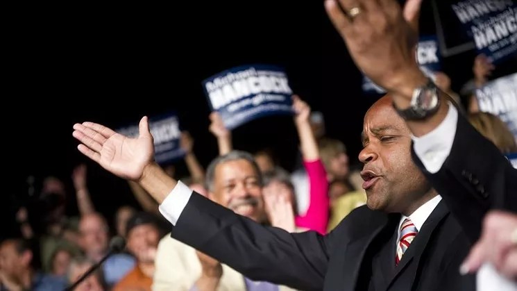 Michael Hancock celebrating his election in June 2011, with former Denver mayor Wellington Webb looking on.