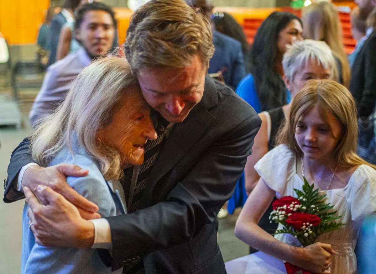 Mike Johnston hugs his mother, Sarah “Sally” Johnston, while his daughter looks on.