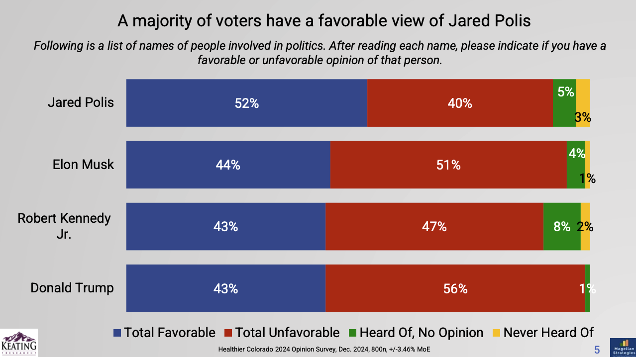 The Healthier Colorado survey also measured voter attitudes toward Governor Jared Polis and Robert F. Kennedy Jr., former presidential candidate and Trump’s pick to lead the U.S. Department of Health and Human Services.