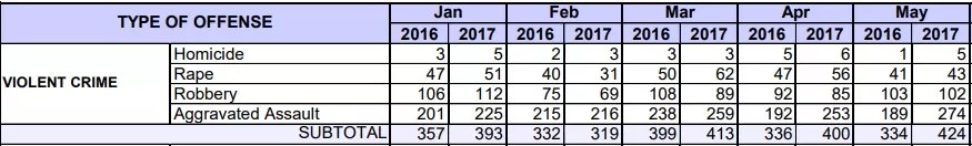 At this writing, the DPD has compiled crime data from January through May of 2017. The following graphic reveals that the number of violent crimes – specifically homicide, rape, robbery and aggravated assault – are collectively up for each month of the year thus far in Denver proper over figures registered twelve months earlier.