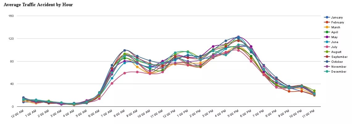 Continue to see average traffic information from 2012 through 2018 for each hour by month. We’ve italicized the figures for the most accidents per month, and as you’ll see, May and October pop up on several occasions.