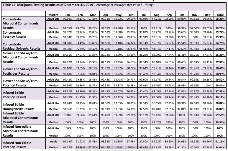 Marijuana concentrates tested at a much safer rate, with over 98 percent of samples passing microbial testing and almost 95 percent passing residual solvent testing in 2019.