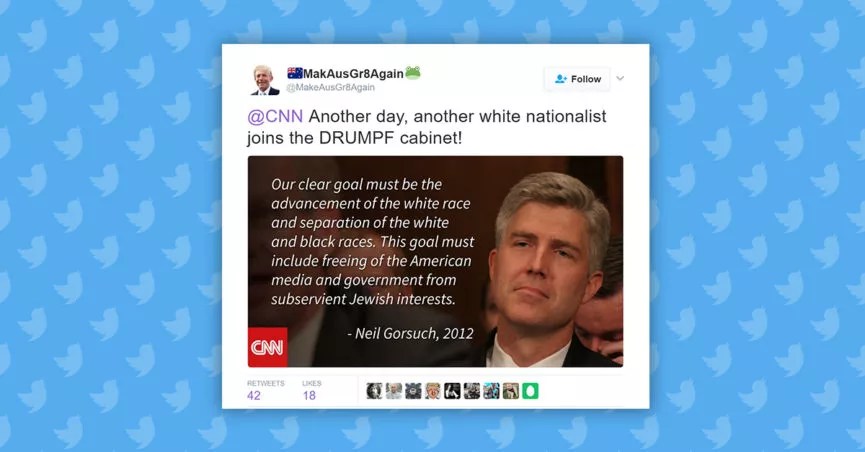 After Gorsuch’s nomination, a couple of racist lines he supposedly uttered in 2012 began circulating via Twitter. The comment: “Our clear goal must be the advancement of the white race and separation of the white and black races. This goal must include freeing of the American media and government from subservient Jewish interests.”