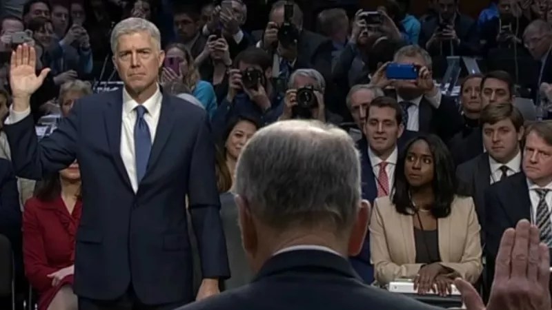 Neil Gorsuch being sworn in at his confirmation hearing.