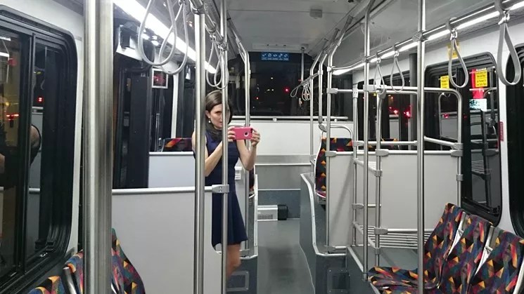 A Denver-area reporter snaps a shot of the new mall shuttle’s interior.