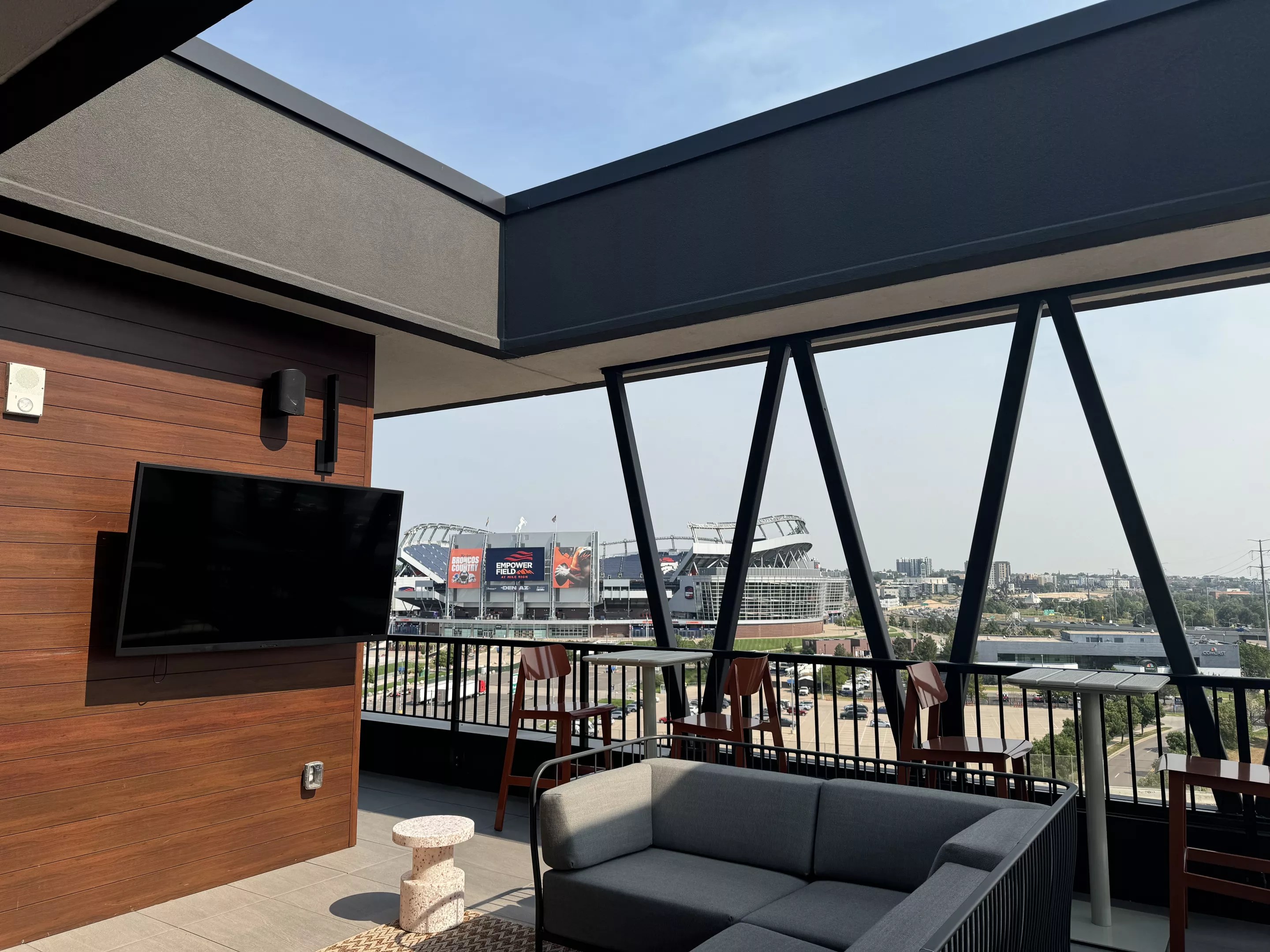 The building references bridges nearby and architectural elements on the indoor-outdoor skydeck, meant to look like steal beams supporting bridges over the South Platte. From the skydeck, people can see the Broncos’ home at Mile High stadium, a great view of Denver’s skyline and the STEAM on the Platte complex, as well as Raices Brewing.