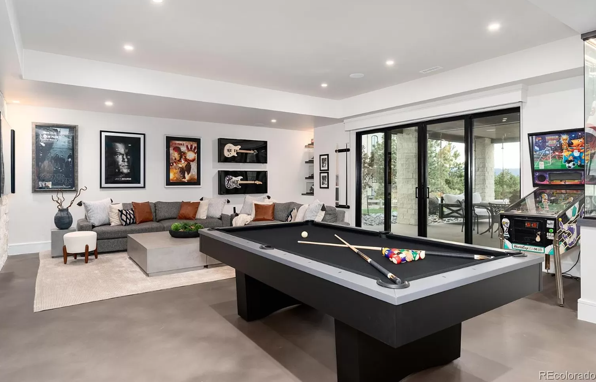 The basement has both hangout space and gym space. Listing photos include Colorado Rockies and Colorado Avalanche merchandise, so the house was clearly designed with a sports fan in mind.