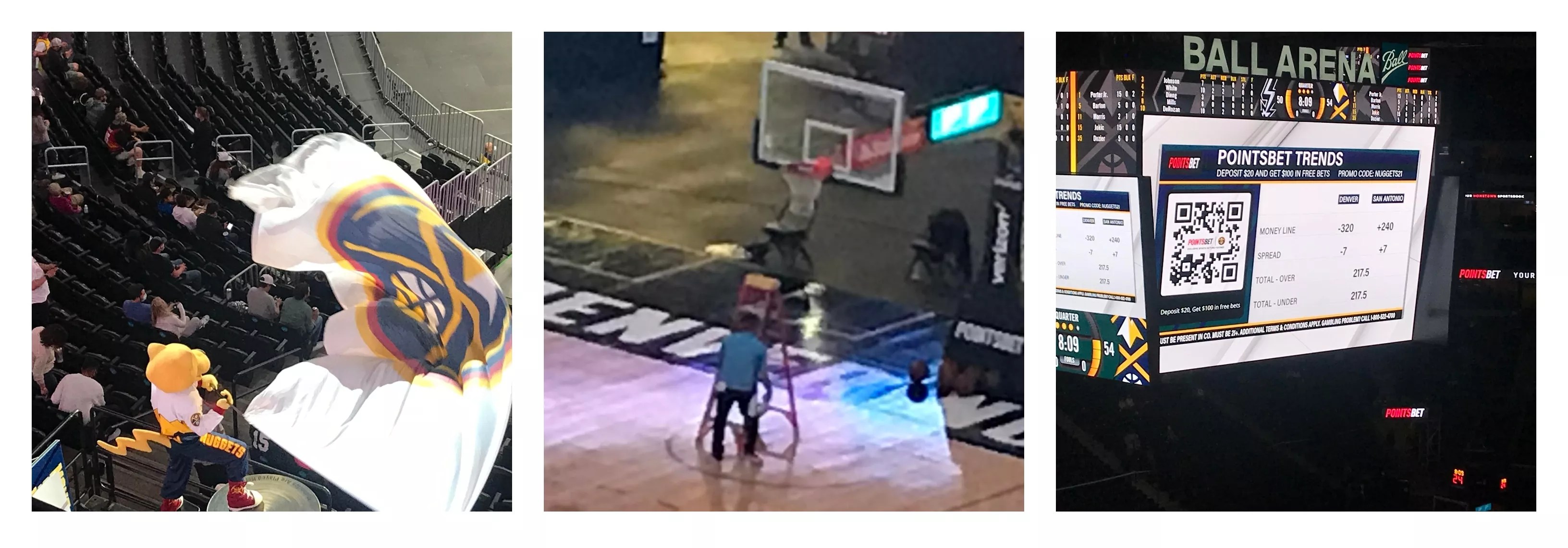 From left: Super-mascot Rocky was penned up most of the night; the backboards and rims were sanitized at halftime; one of many ultra-aggressive PointsBet promotions.