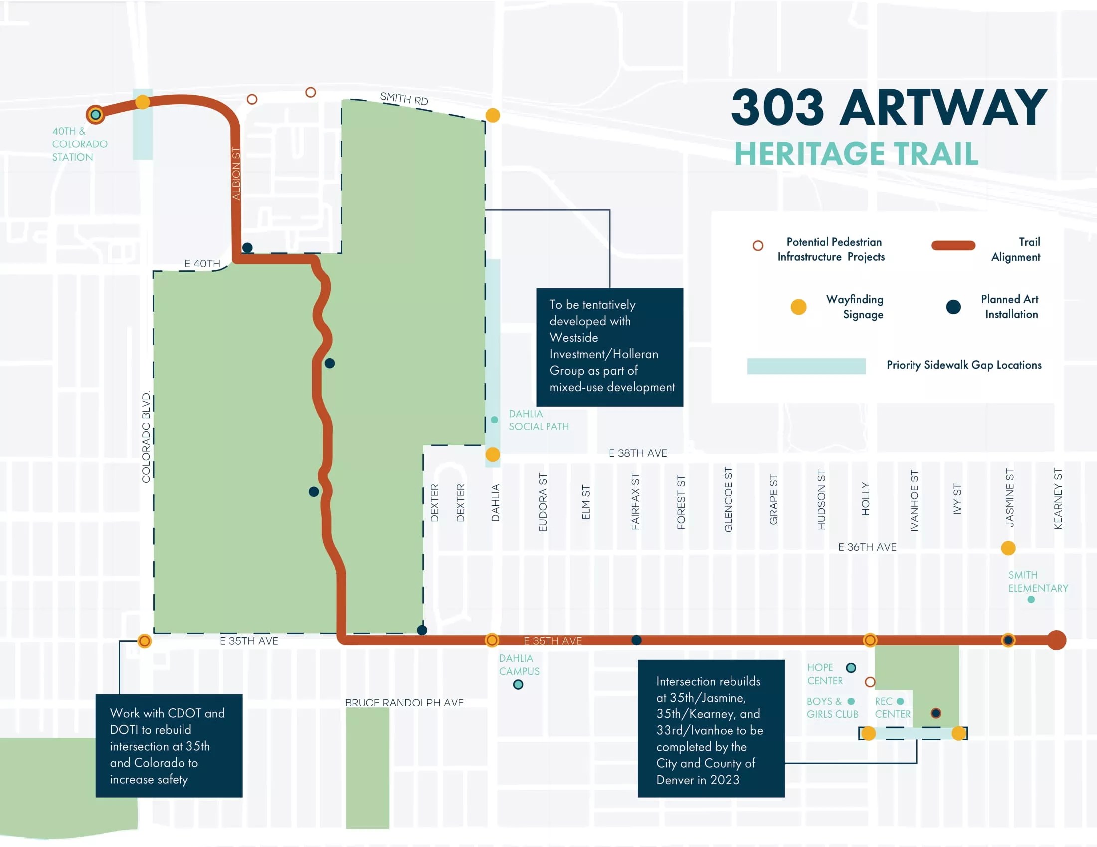 The idea for establishing the 303 ArtWay Trail came out of community meetings that the Urban Land Conservancy held in 2014. The ULC owns significant real estate holdings across Northeast Park Hill.