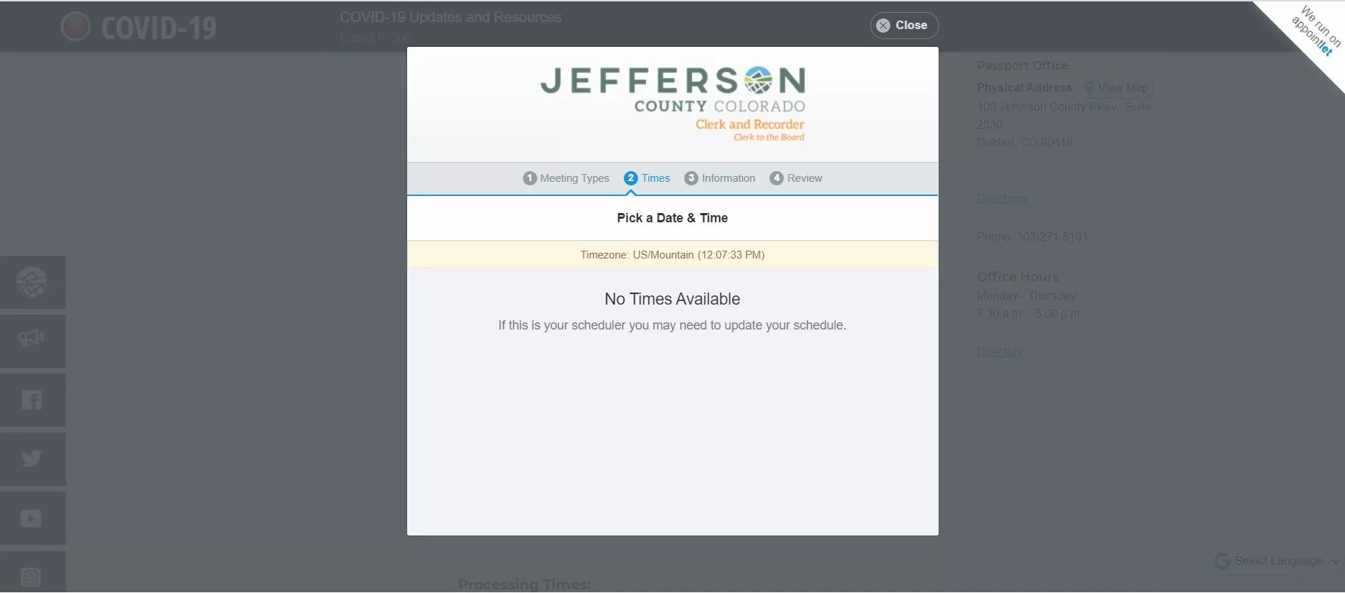 Screenshot of Jefferson County’s web page for booking passport appointments.