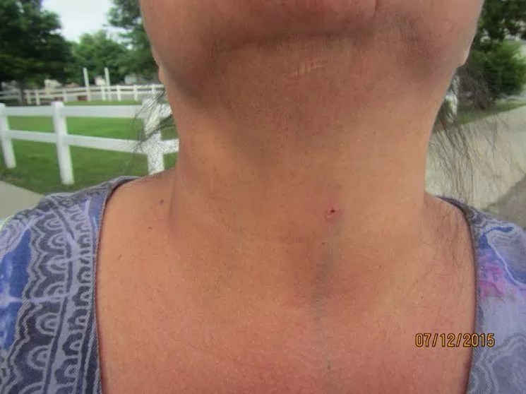 That’s when Castaway, whom she believed to be drunk, busted into the residence – she’d previously kicked him out – and poked her in the neck with a knife. Here’s a look at the puncture wound, in a photo provided by the DA’s office….