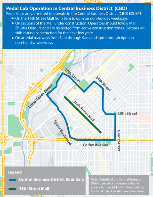 On August 11, DOTI announced that the city would be expanding the areas where pedal cabs could legally operate, saying the changes would expand drivers’ access to Empower Field at Mile High as well as open up the RiNo Art District, Auraria and more of Capitol Hill.