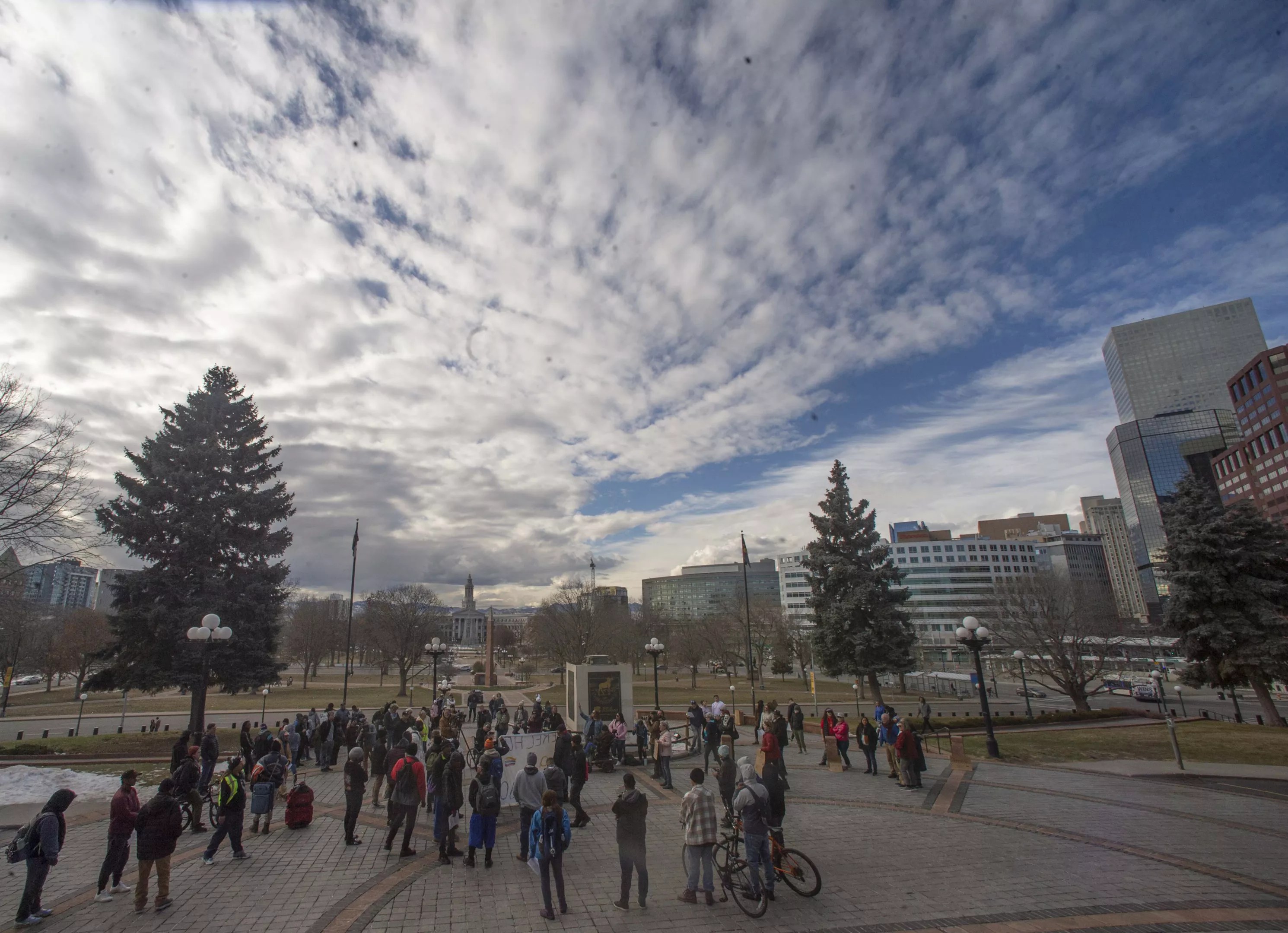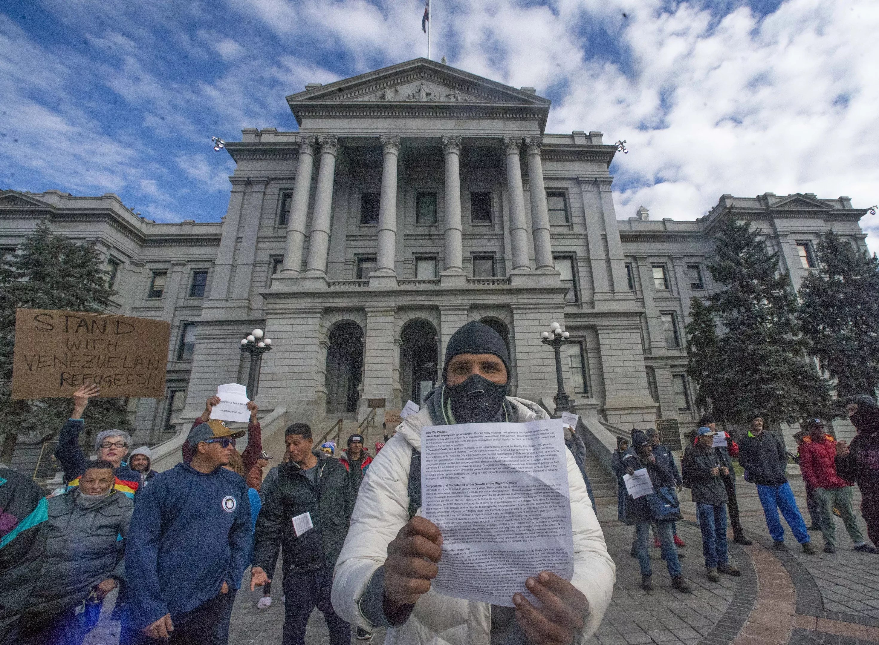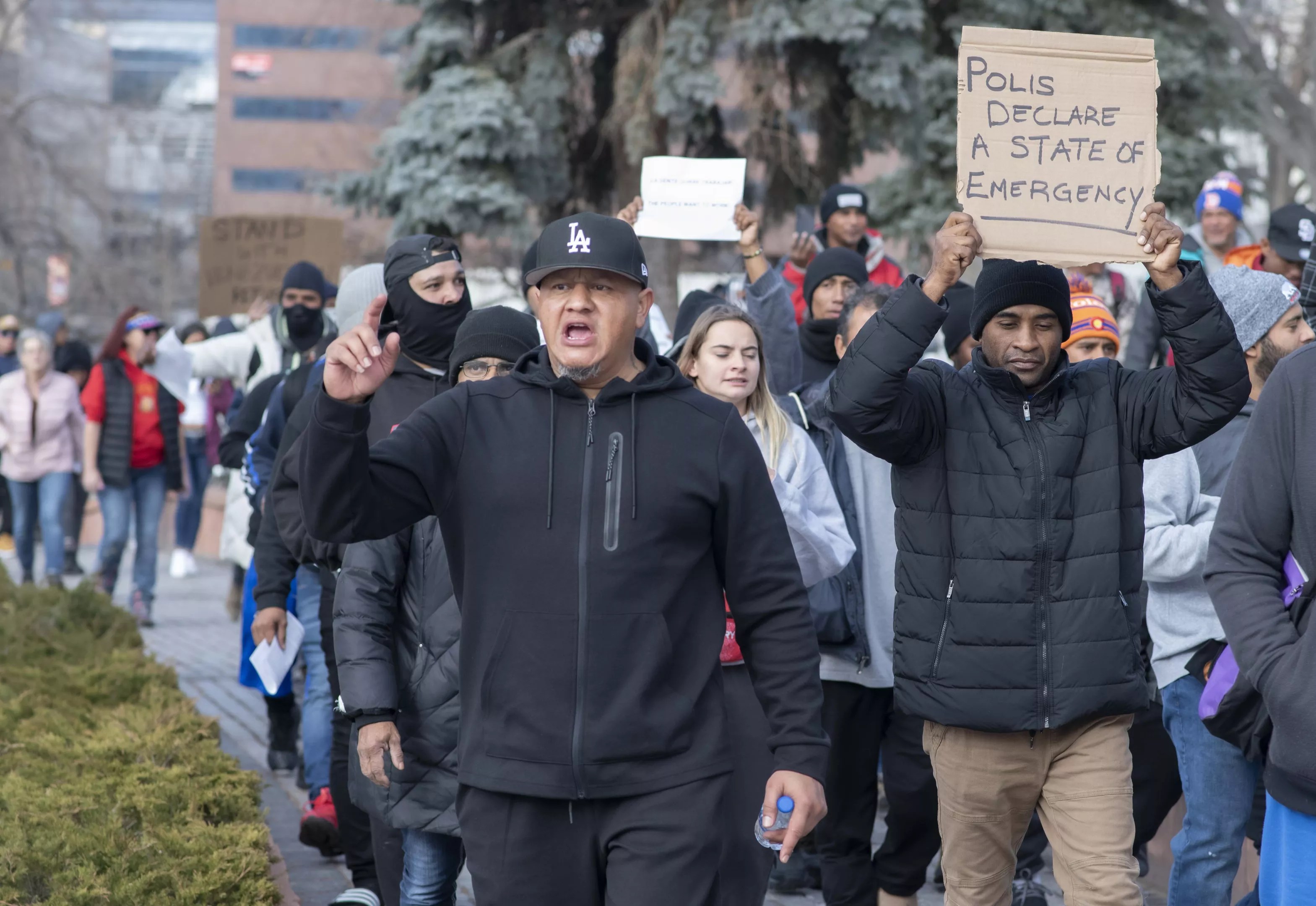 Demonstrators head to the Colorado Capitol to ask Governor Jared Polis for help for migrants.