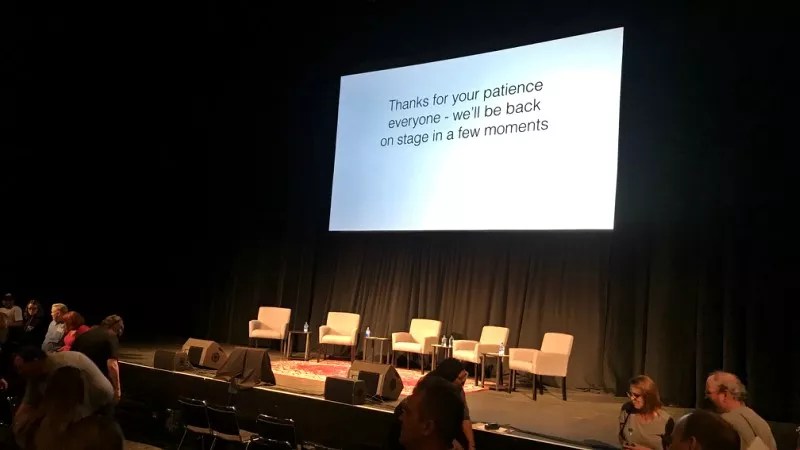 While this was happening, Favreau and Lovett occasionally got updates on the woman’s condition. Ticket holders finally got one of their own by way of a hastily assembled graphic that read, “Thanks for your patience everyone – we’ll be back on stage in a few moments.”