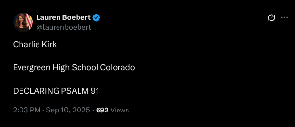 In a post on social media, Colorado Congresswoman Lauren Boebert said she was “praying” for Kirk, and also posted (and then deleted) a statement about his shooting and an active shooter at a high school in Evergreen, Colorado.