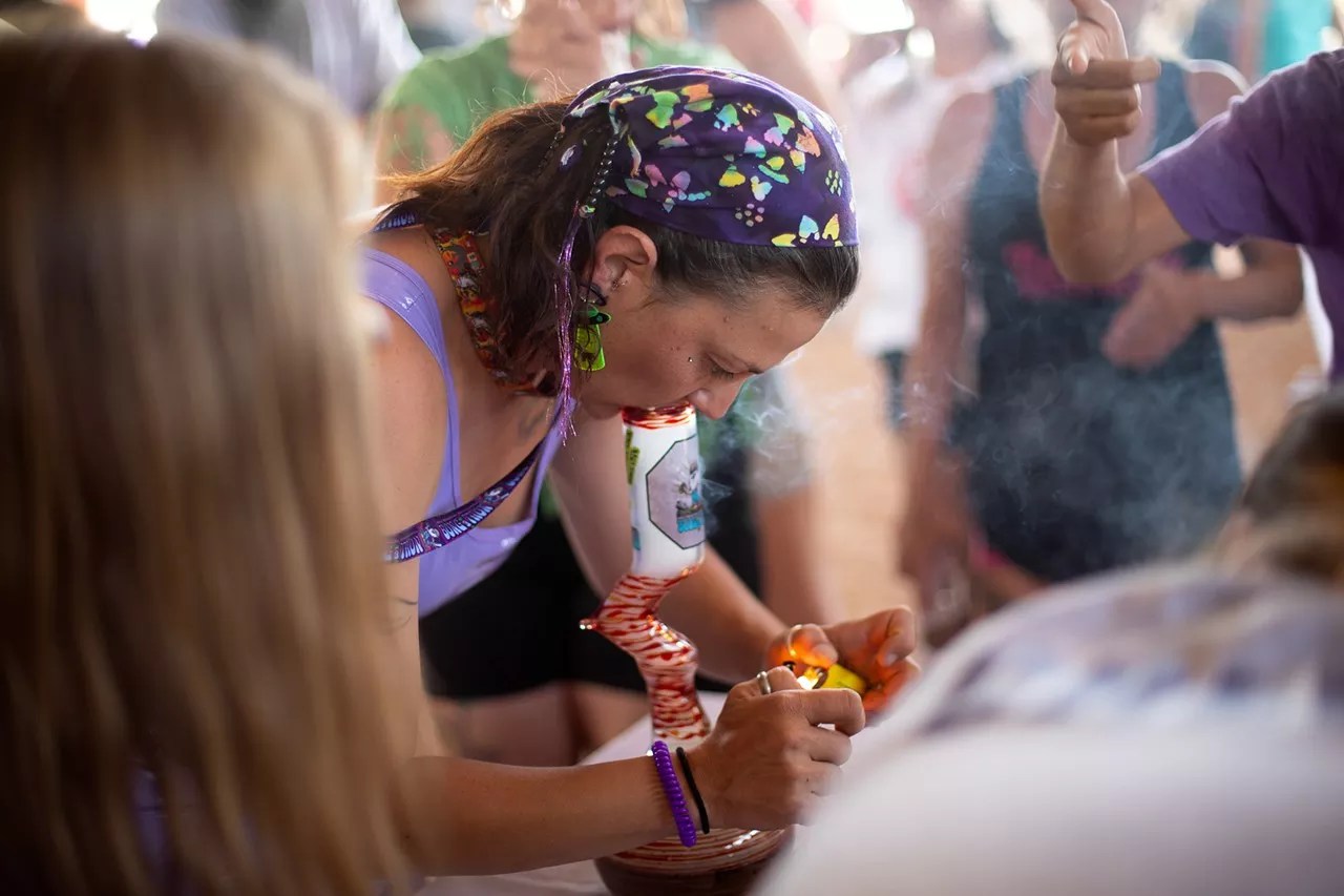 A friend of a competitor fans a bong hit to burn the flower faster.