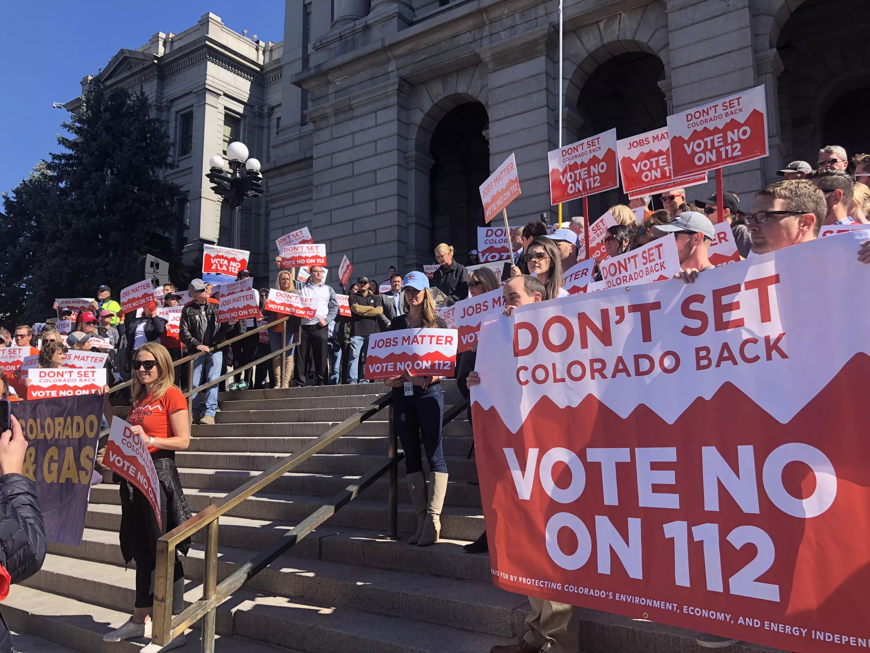 The rally was organized by Mayors Against Proposition 112 and led by Johnstown Mayor Scott James. James said at the rally that he’s organized fifty mayors, including Denver Mayor Michael Hancock, from all parts of Colorado to oppose the measure because it would hurt the state’s economy.