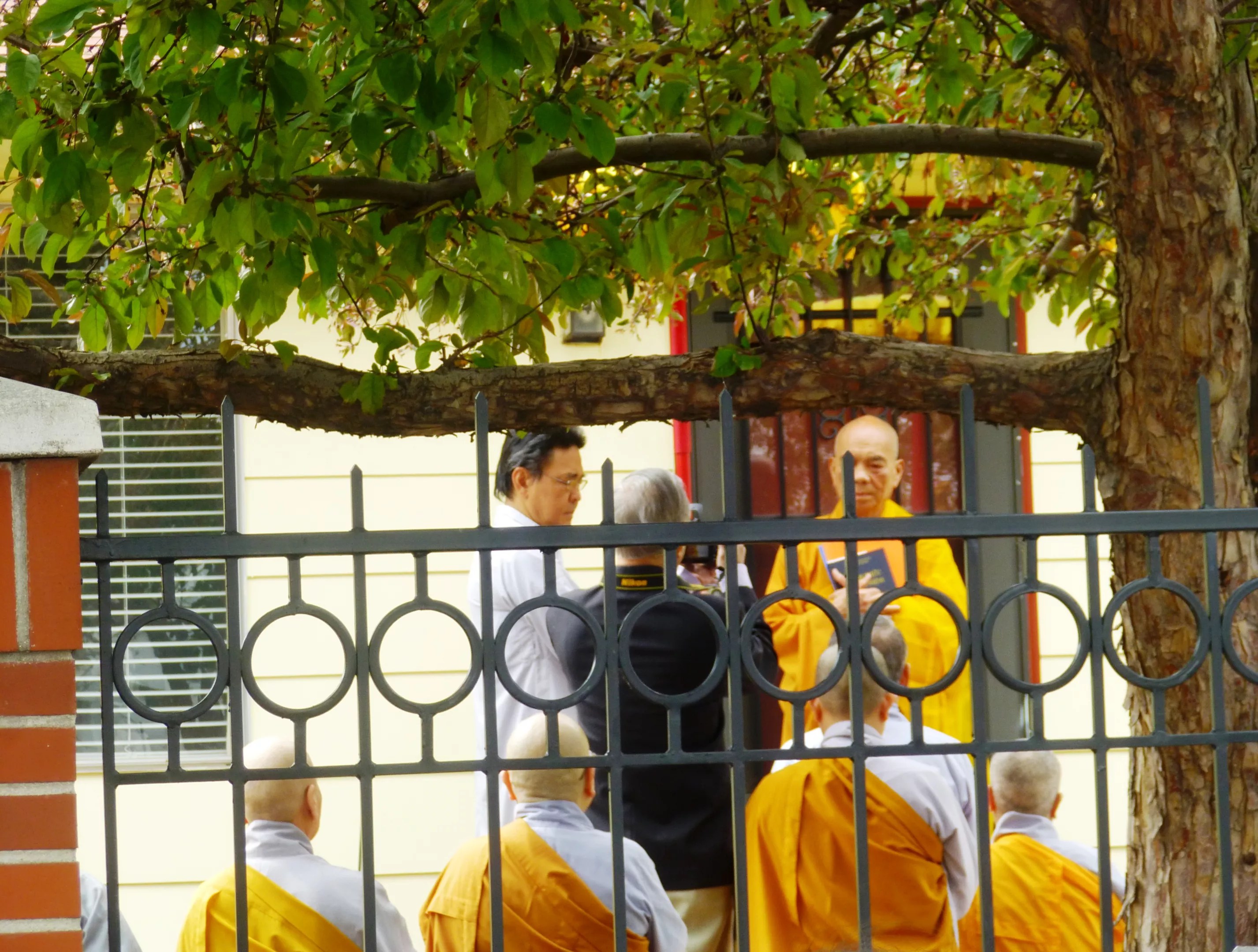 Cuong Kim Le, also known as Thich Chanh Lac (in yellow robe facing camera), conducts services on Buddha’s birthday while protesters watch from outside the fence.