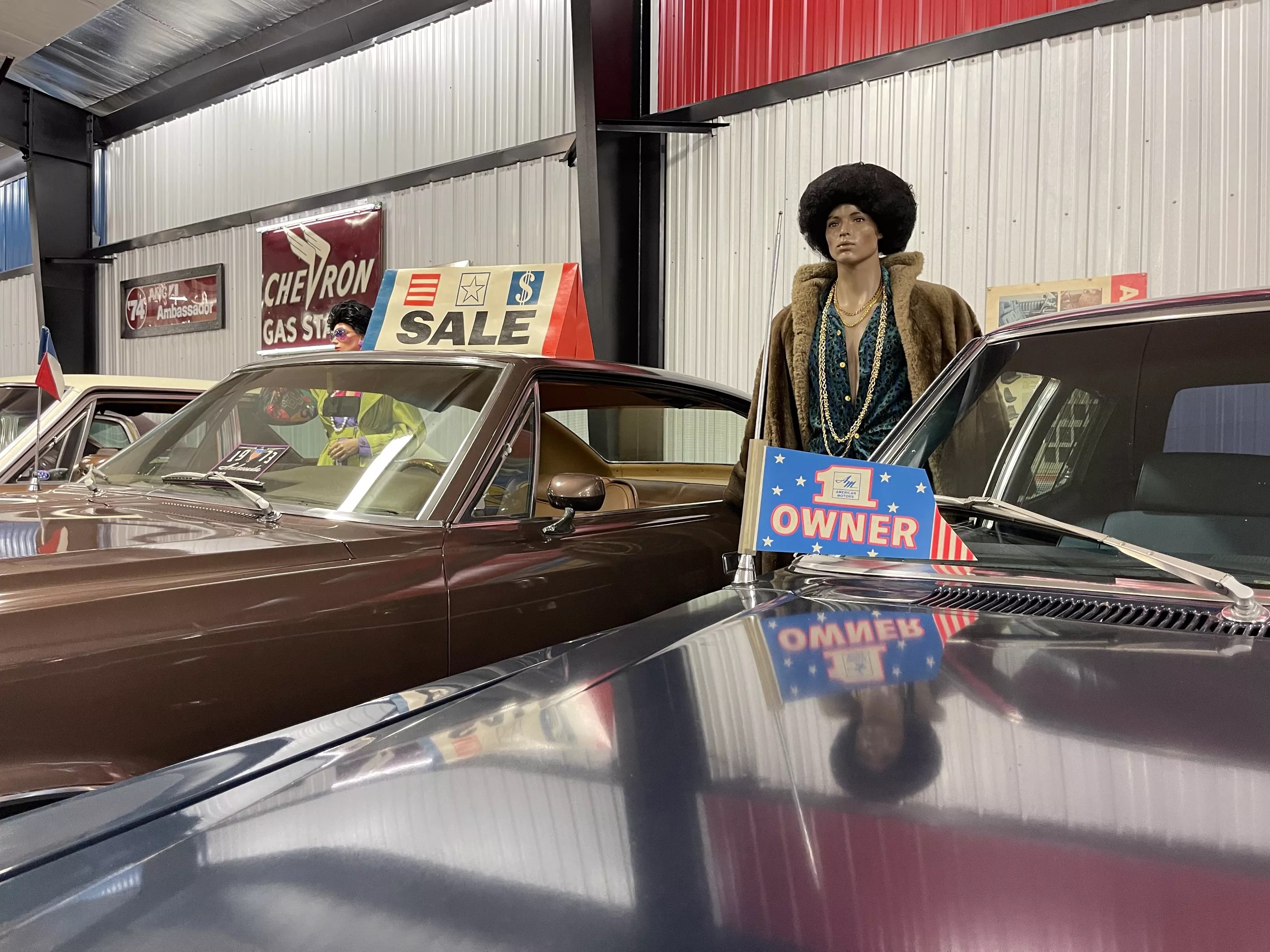 Inside Rambler Ranch’s “Nash” building, with dozens of restored cars and collectibles — including the dress worn by Colleen Kay Hutchins, Miss America 1952, in advertisements for Nash Motors.