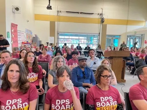 Members of Resign DPS attend a Denver school board meeting.