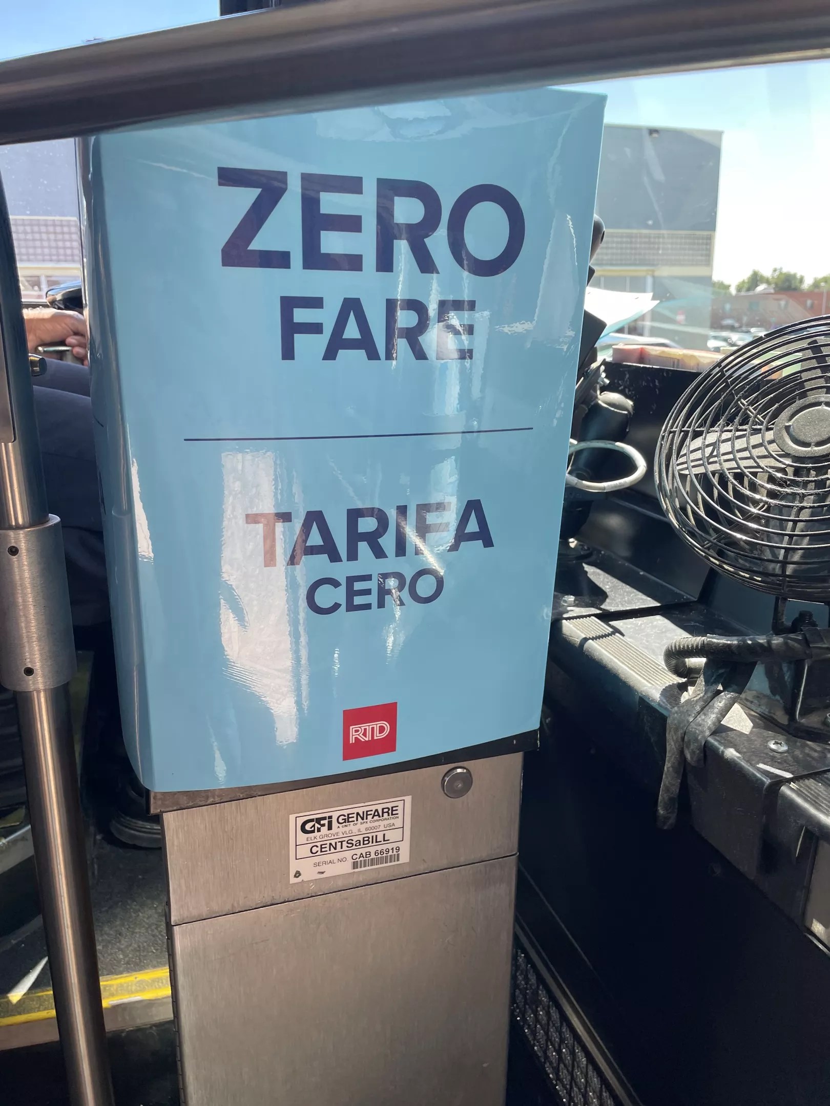 Free-fare signage has replaced the usual fare collection system on RTD buses.