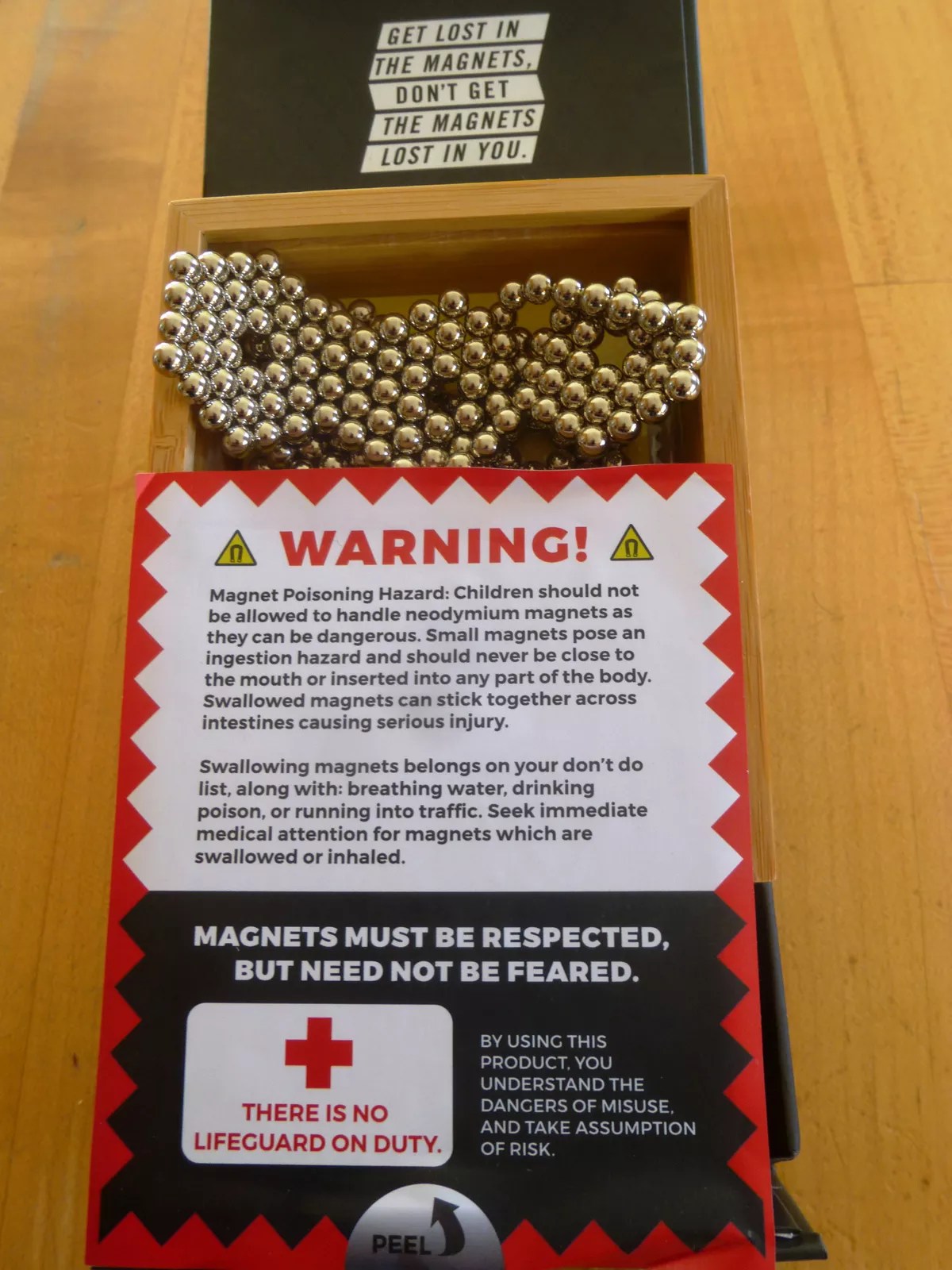 First you have to remove a tough metallic sticker from the cardboard container, which brings you face-to-face with a warning on the end flap that neodymium magnets are not for children, that swallowing them can cause serious injury or death, and that “seal removal implies assumption of risk.” Under the flap are more exhortations: “Intelligence Required” and “Get Lost in the Magnets – Don’t Get the Magnets Lost in You.”