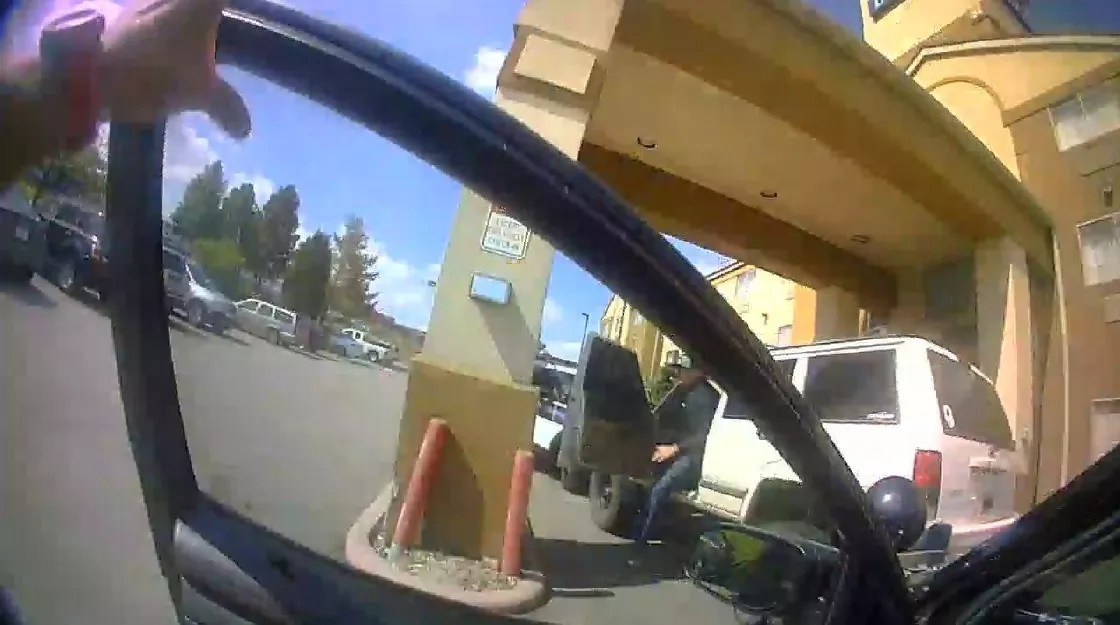 A screen capture showing three officers aiming their firearms at the late Nico Descheenie.