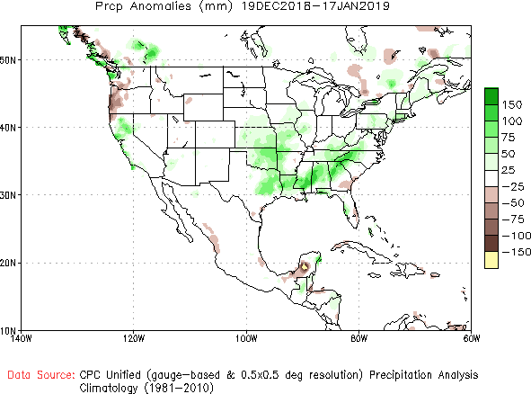 Above-average precipitation has been noted across the southern U.S., which is likely the result of El Nino-related conditions.