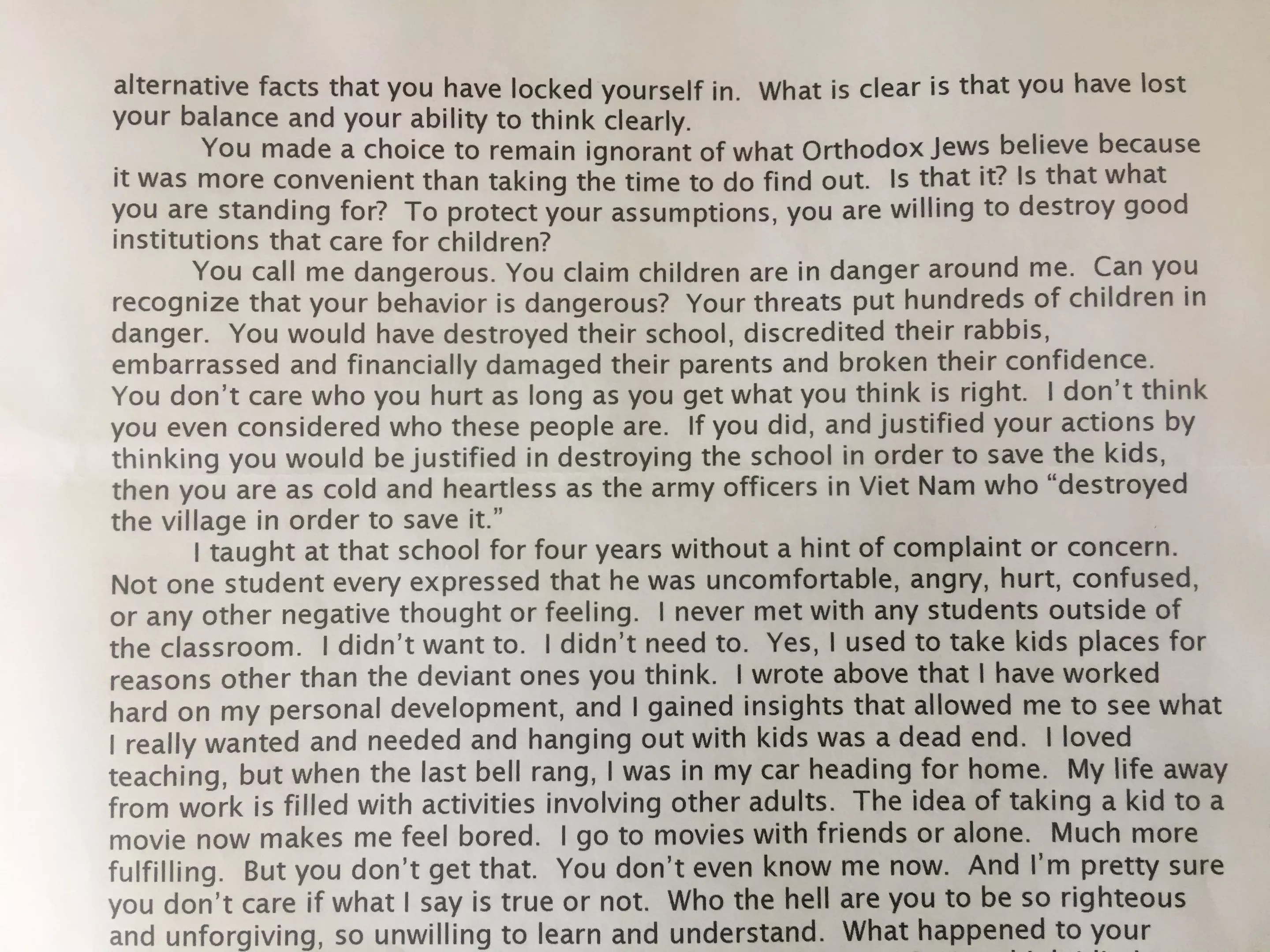 When Durant tracked Myers down to Yeshiva Toras Chaim last January, she says she quickly told the administration about his past and sent them resources – like the 1996 Santa Cruz police report written by a detective in which Myers admits being attracted to teenage boys: