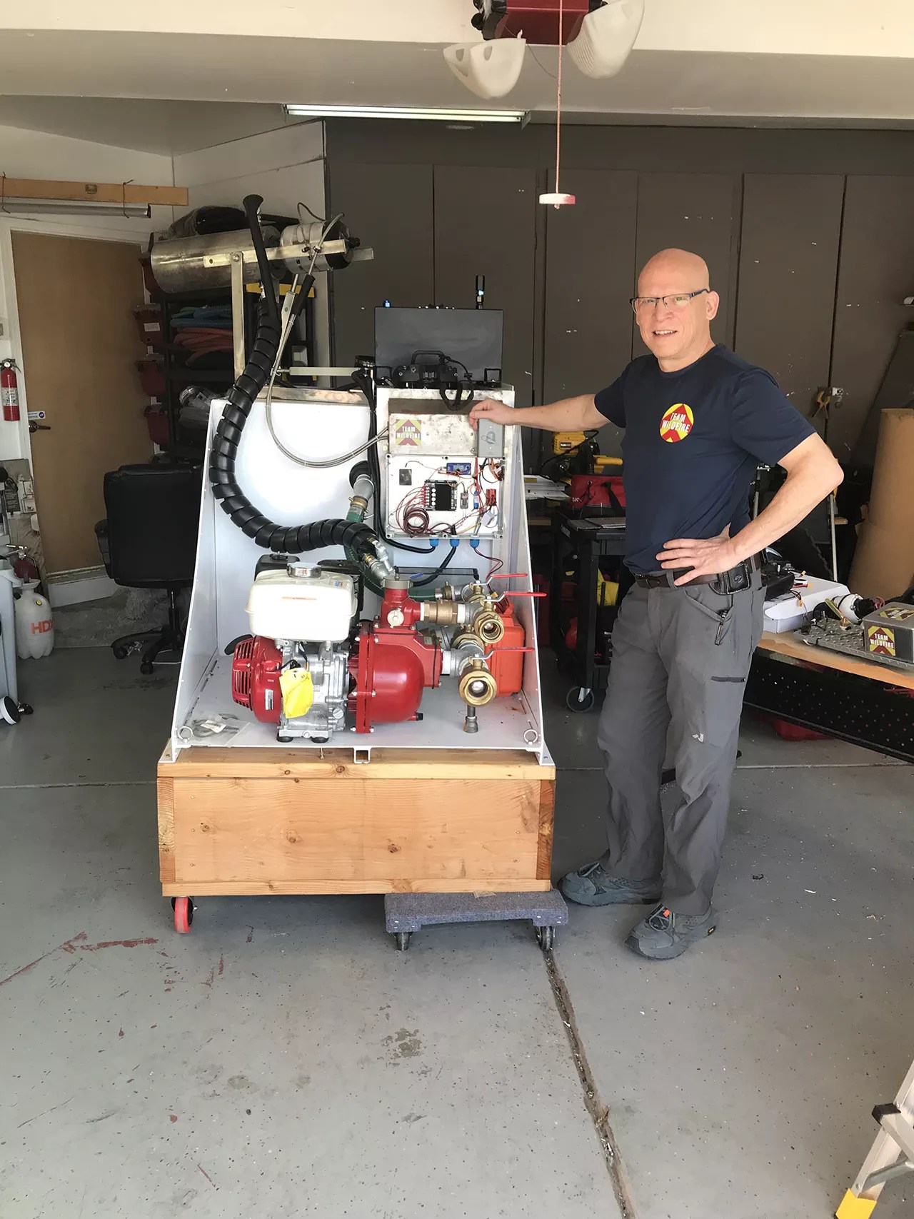 Wolf has been preparing for this heat and this moment for a decade, more like three decades. Inside his garage is what he calls a small “Hurricane on wheels,” the most high-tech firefighting equipment yet invented. His timing for introducing it comes at a critical moment.