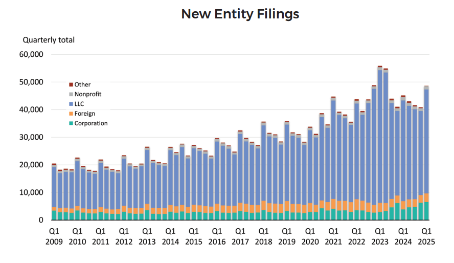 Despite that lack of confidence, Colorado’s businesses are still growing. There were 48,629 new business entities filed with the Secretary of State’s office in the first quarter of 2025, which represents 7.7 more than were filed in the first quarter of 2024. Most filings were for LLCs.