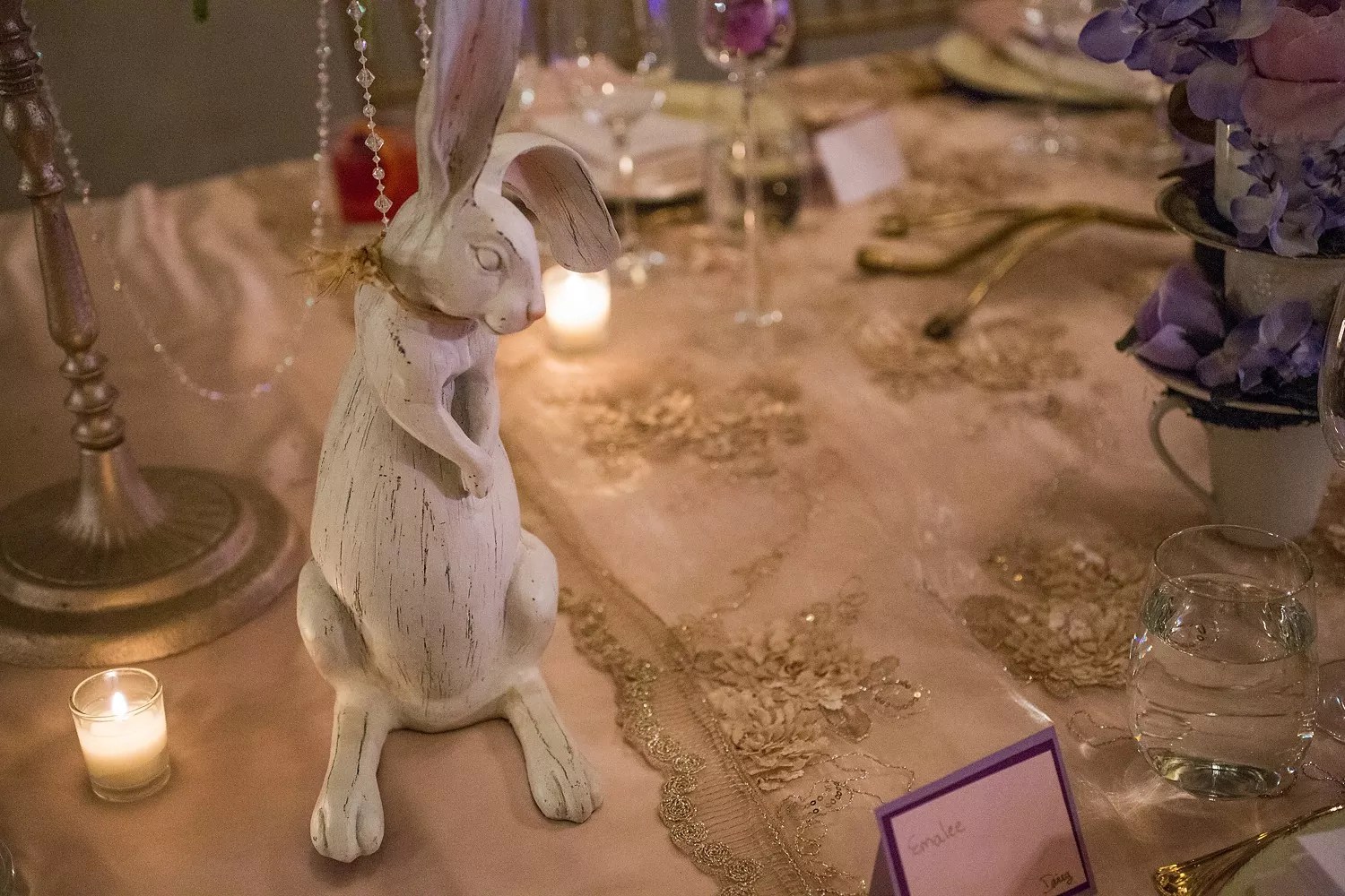 Pink and purple accents, fancy silverware, fresh flowers and a long banquet table could be staples at ay fancy dinner party, but the ceramic rabbits, small clocks and stacked teacups here reminded guests that they were in Alice’s dream.