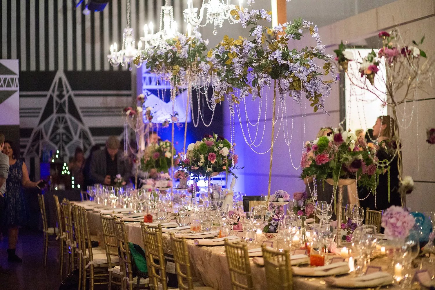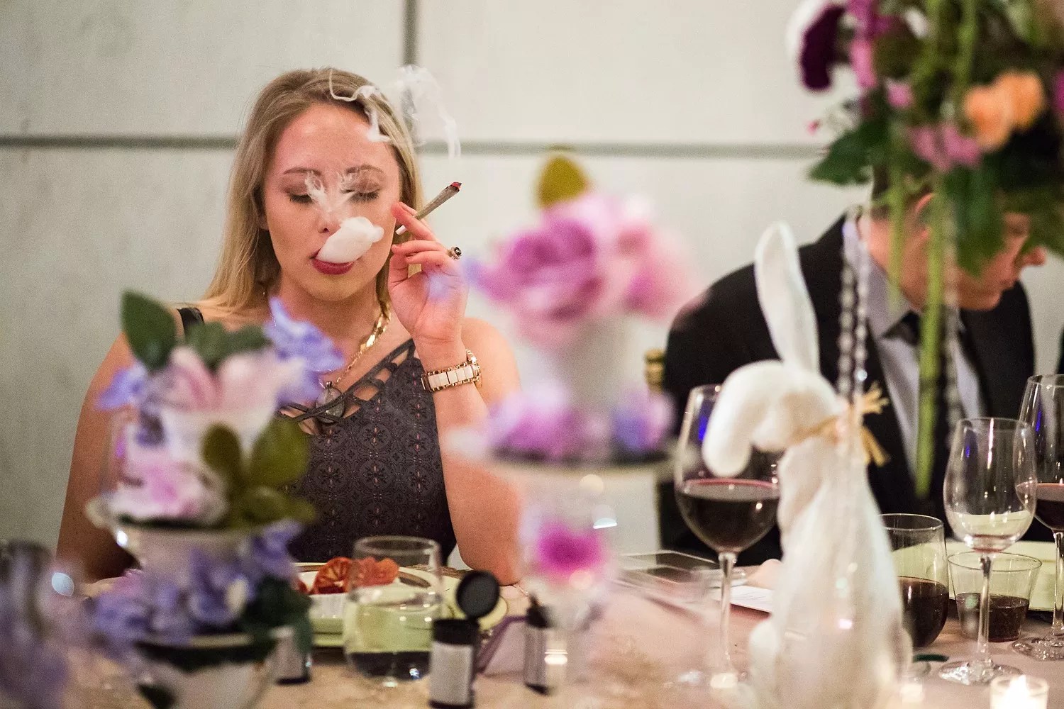 To transport people to a fantasy world, you must first create an atmosphere that takes them away from the bustle of the real world. At this cannabis dinner, guests walked in under a canopy of gold fabric into a fantasy with vaulted ceilings, chandeliers draped with crystal, and purple lights warming the white walls. It was everything a five-year-old girl imagines during tea parties with her stuffed animals.