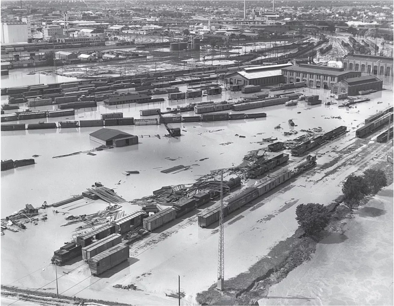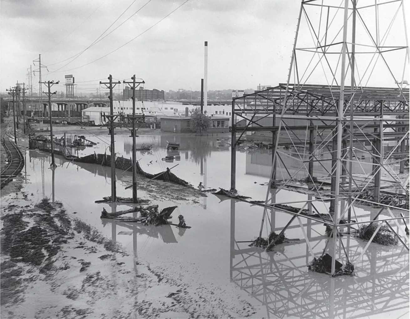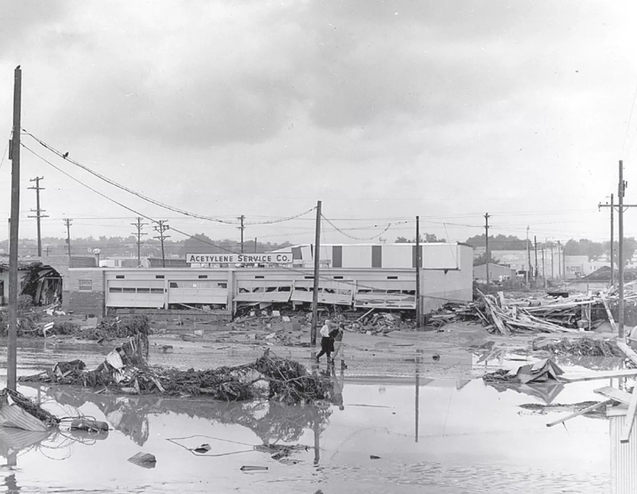 And after a while, there wasn’t anything to see hardly anywhere. Harold Price, main district plant superintendent for Mountain States Telephone, headed downtown on the 14th Street viaduct at half past four in the morning, after the floodwaters had begun to ebb, and saw a city plunged into darkness. He could make out the shapes of boxcars flipped over in the train yards, but there were no streetlights. The police were directing traffic with flashlights.