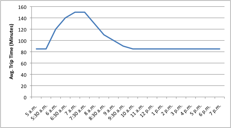 As the charts show, the time of departure from Denver on a Saturday morning has a profound impact on drive time; the difference between leaving at 5:30 and leaving at 6:30 a.m. is nearly 55 minutes of driving. The worst time to leave Denver is between 7 and 7:30 a.m., when the commute to Silverthorne takes nearly two and a half hours as opposed to 1 hour and 25 minutes without traffic.